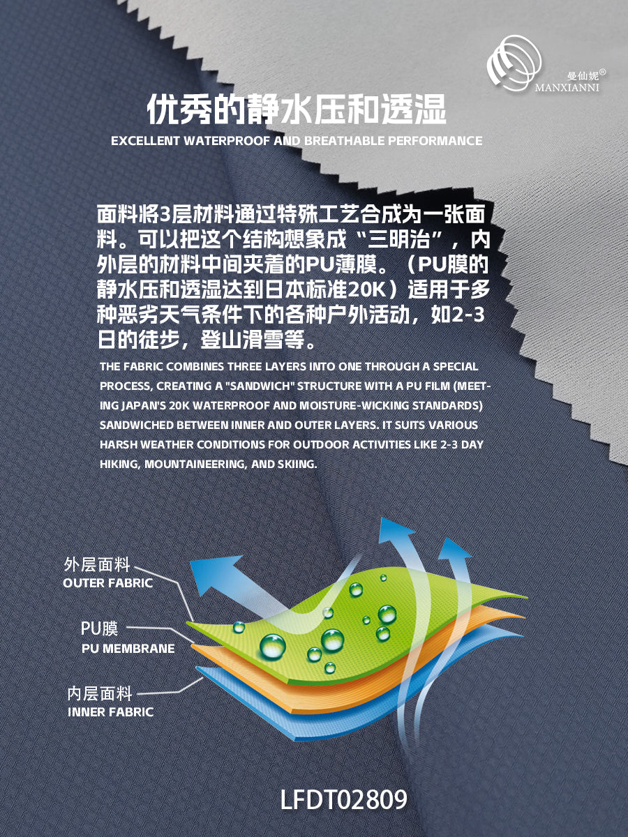 工艺 Finish:P/D,W/R,PU Laminatio ,Bonding克重 Weight: 130GsM+5%幅宽 Width: 140CM+5%功能 Function: Water-proof,PU 20K/20K