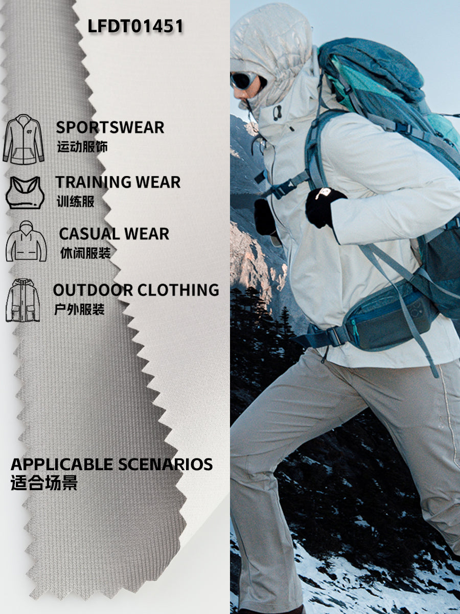 编号 Code:LFDT01451成分 Comp.: FACE:100%N66 BACK:100%P工艺 Finish:P/D,W/R,PU Lamination,Bonding克重 Weight: 90GsM±5%幅宽 Width: 145CM±5%