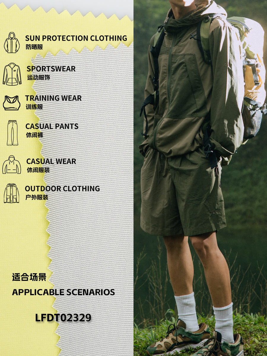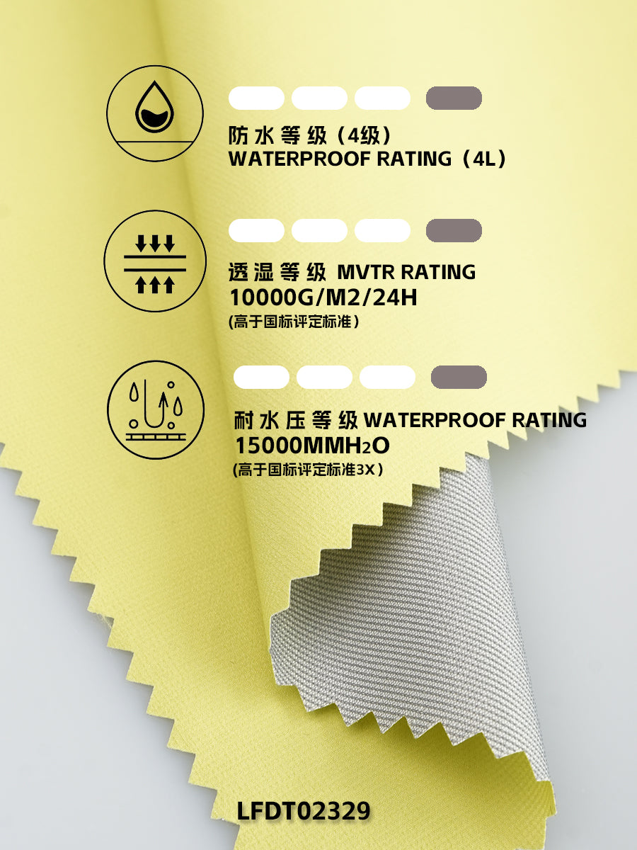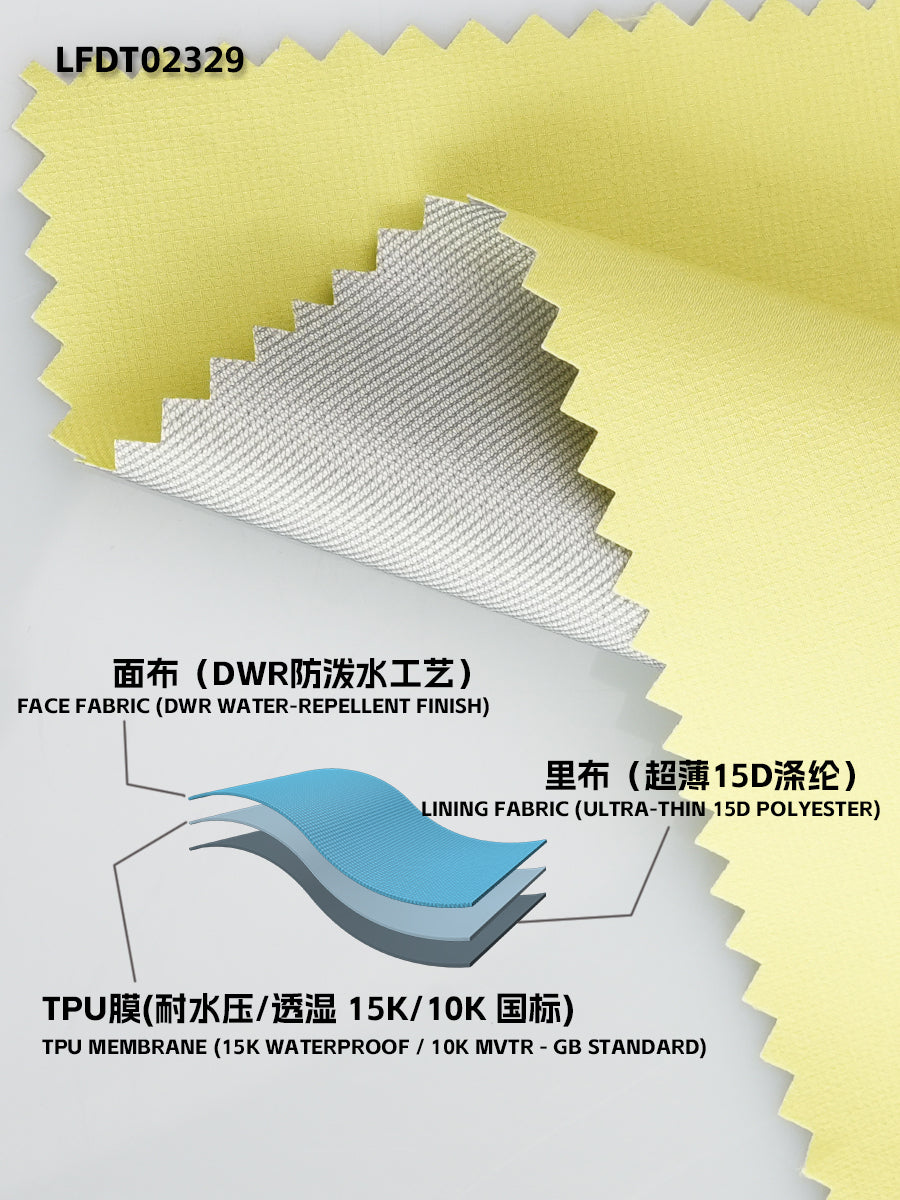 编号 Code:LFDT02329成分 Comp.:100%P工艺 Finish:P/D,W/R,TPU Lamination,Bonding克重 Weight: 102GsM±5%幅宽 Width: 140cM±5%